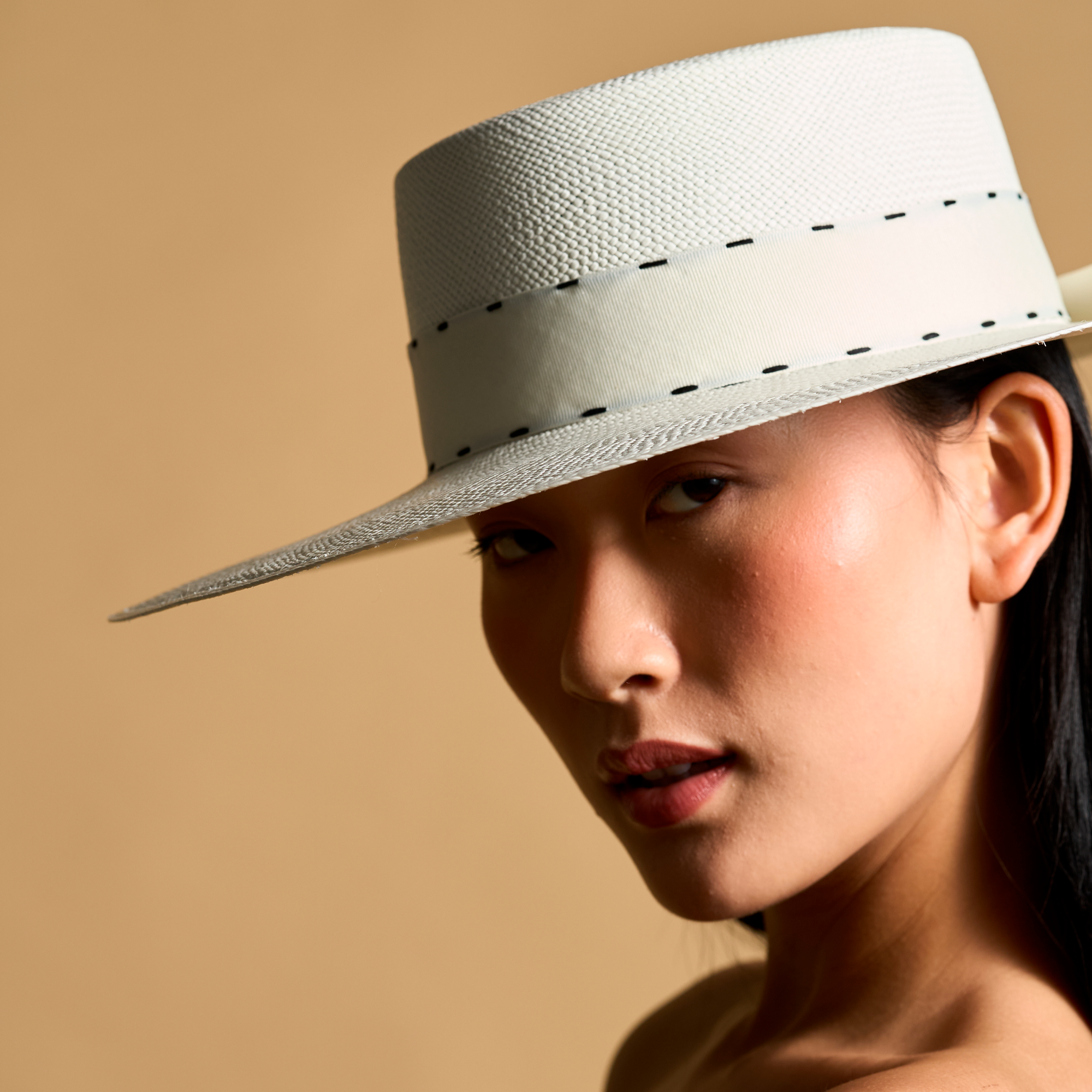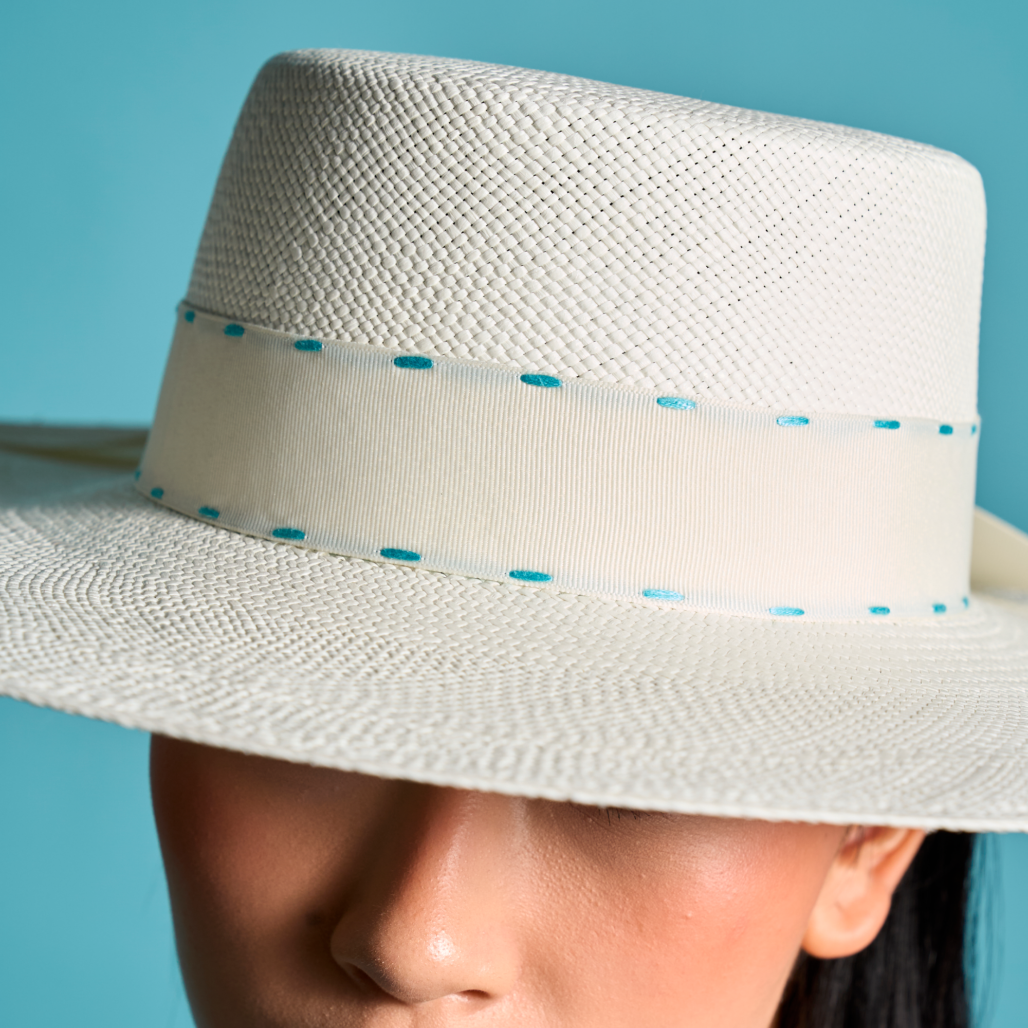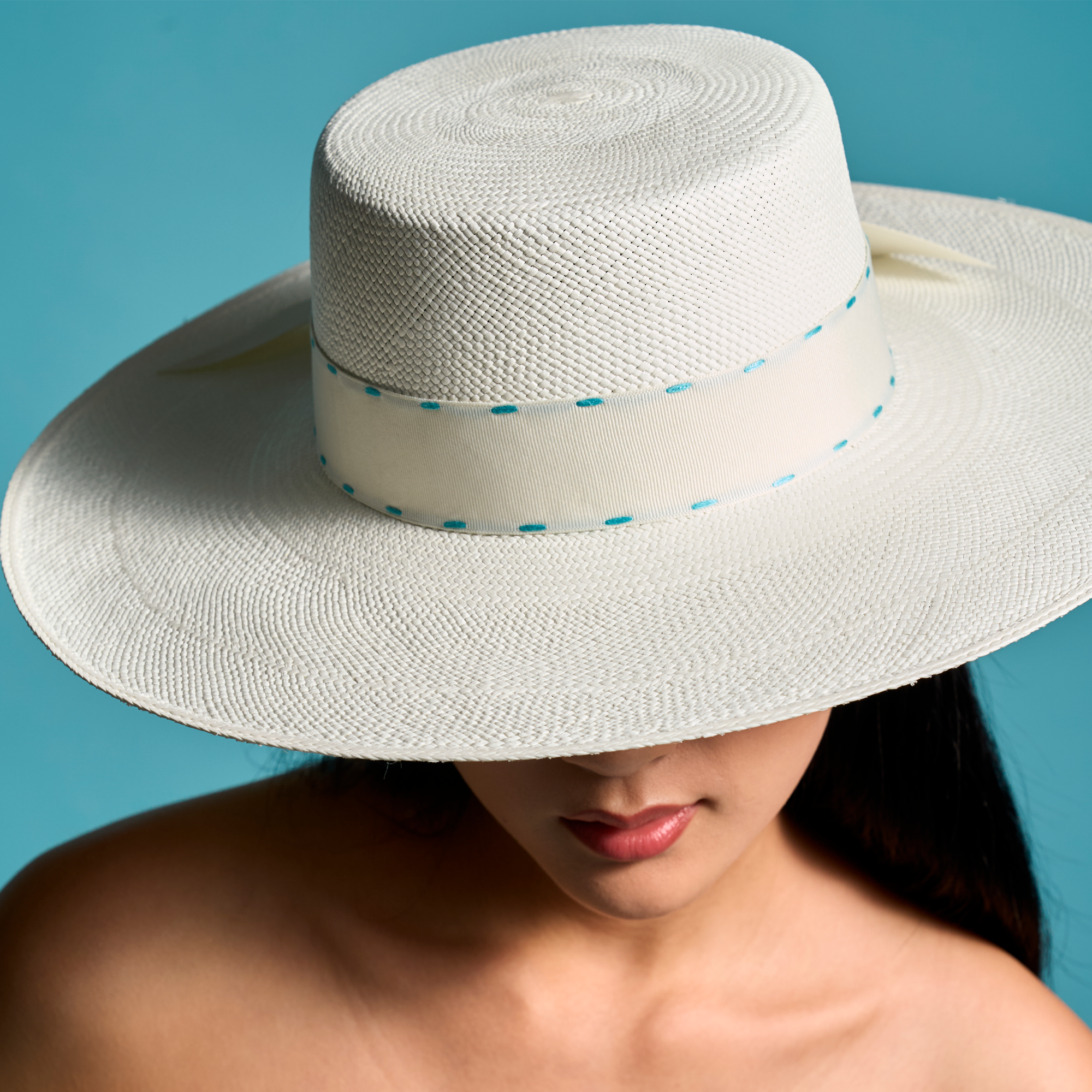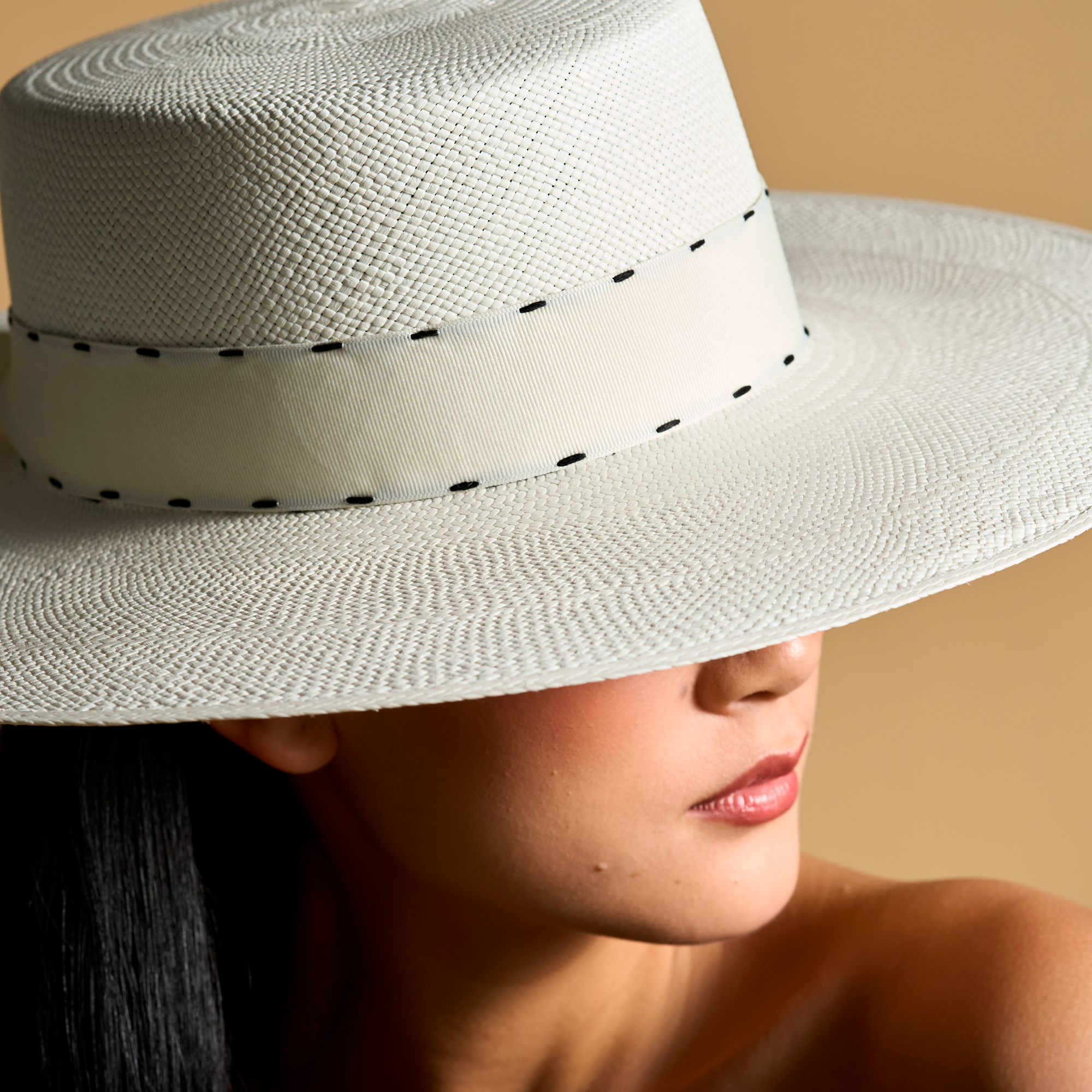 A beautifully crafted ribbon band with intricate embroidered details encircles the boater crown, adding a delicate yet distinctive touch. Handwoven from natural Toquilla straw, the Amalia Hat blends classic structure with modern refinement.