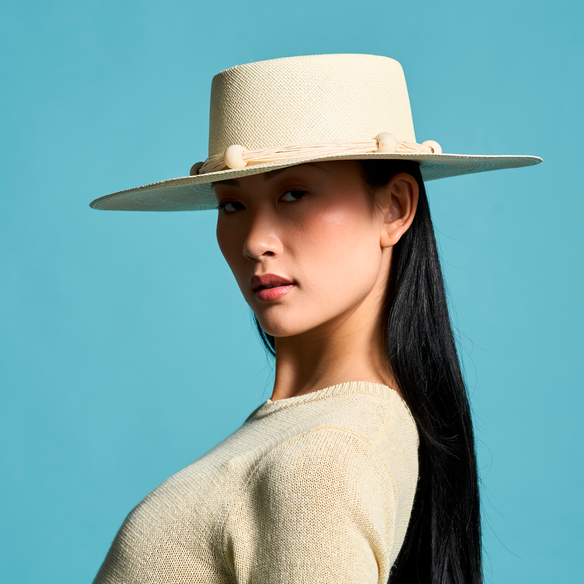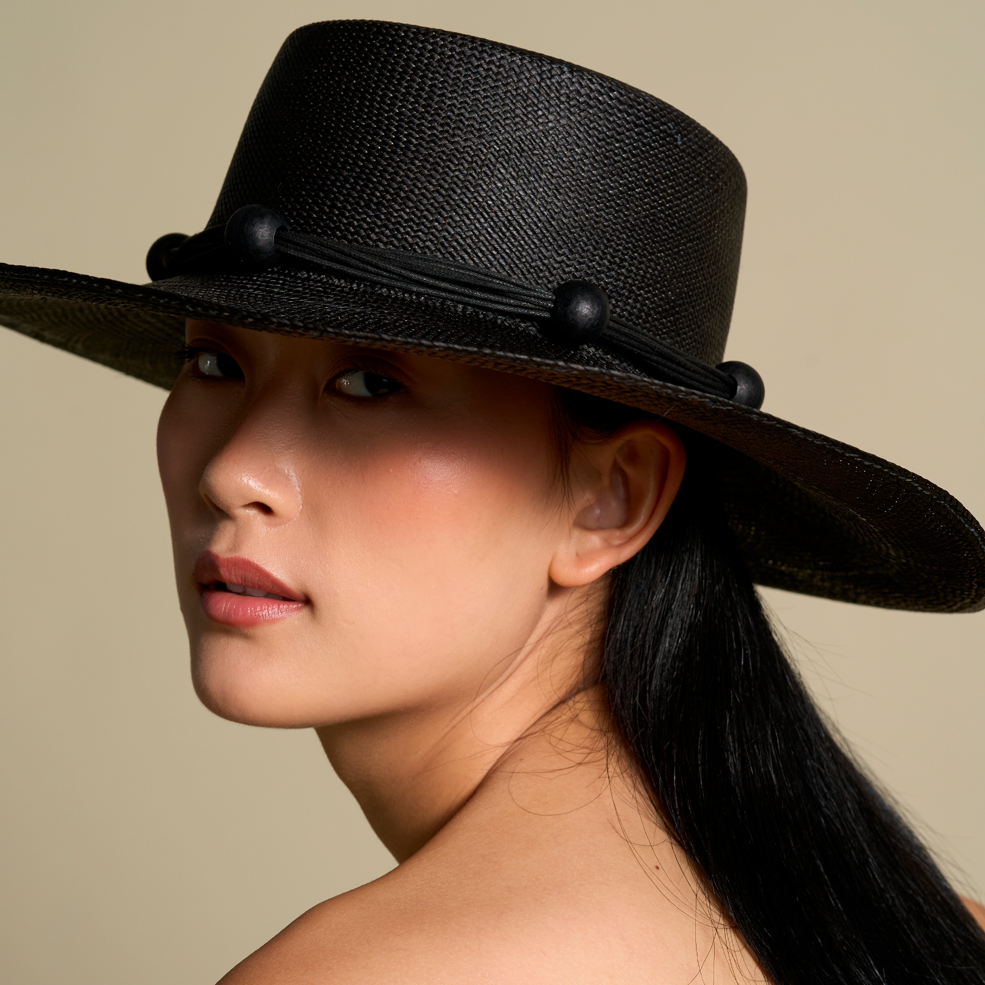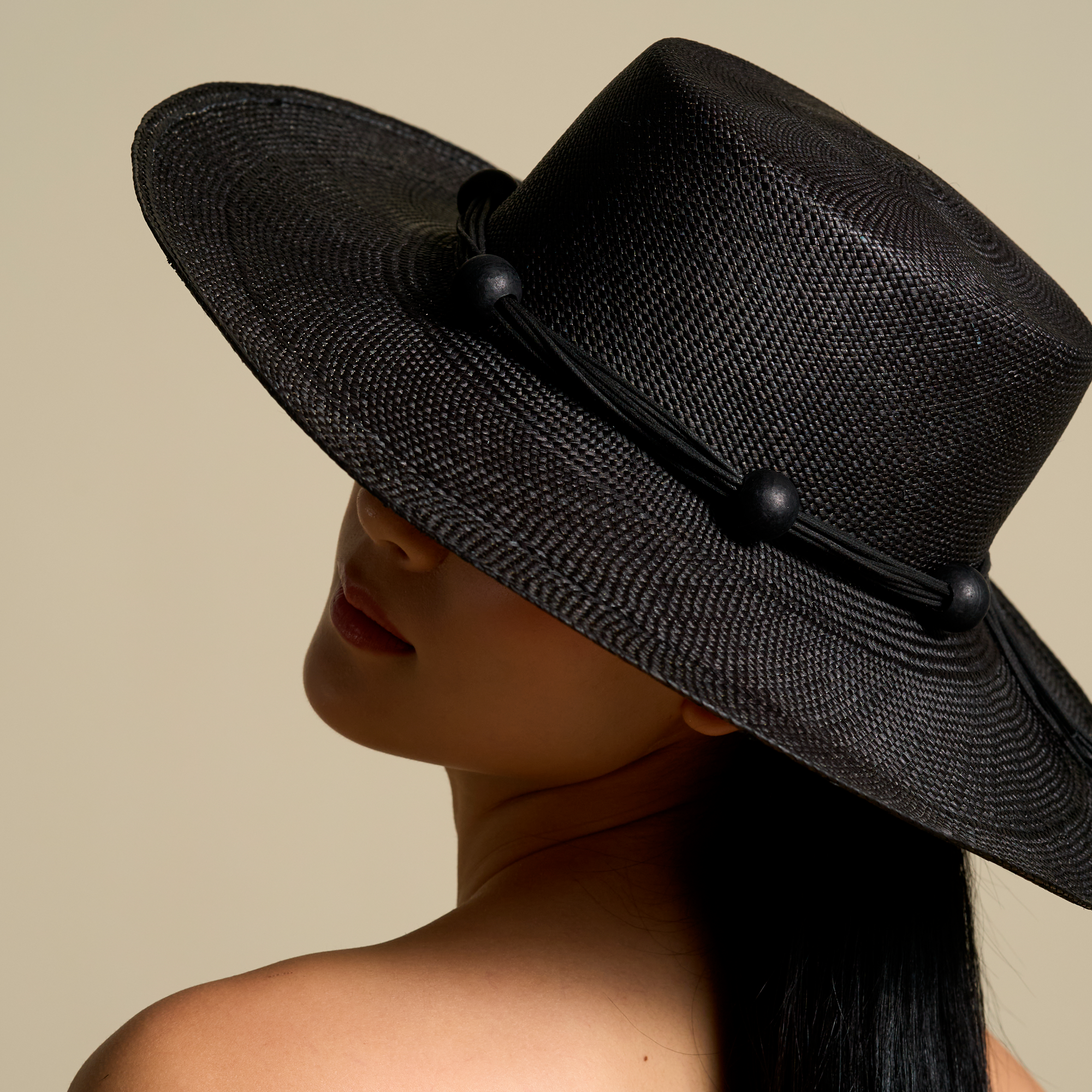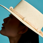 A generous layer of fine cords encircles the crown, accented with large, round tagua beads for a bold yet refined finish. The result—an artisanal piece that merges natural beauty with modern sophistication, designed to elevate any look with ease.