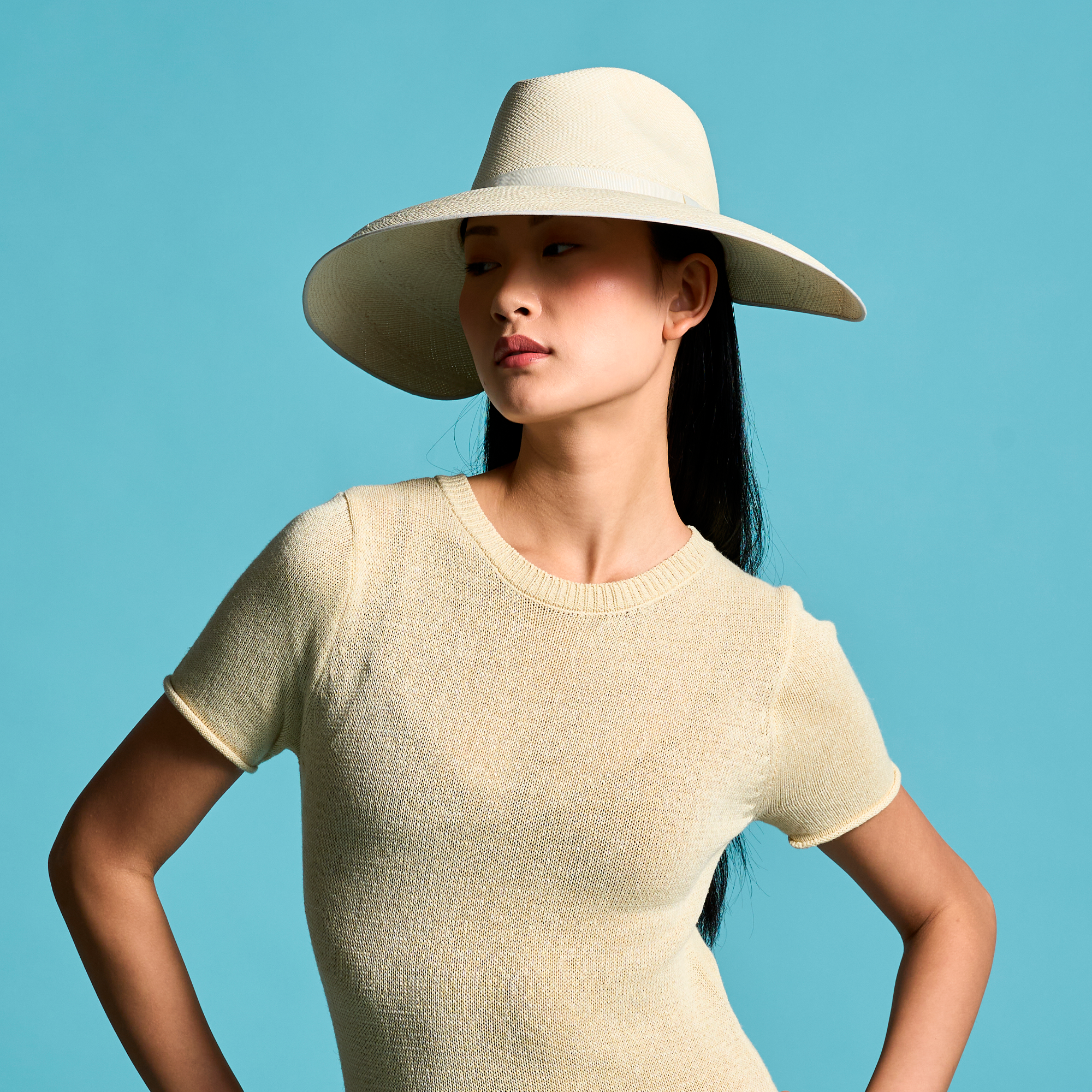 Woman in a straw cowboy hat, showcasing the wide brim Anna Visor Hat in toquilla straw