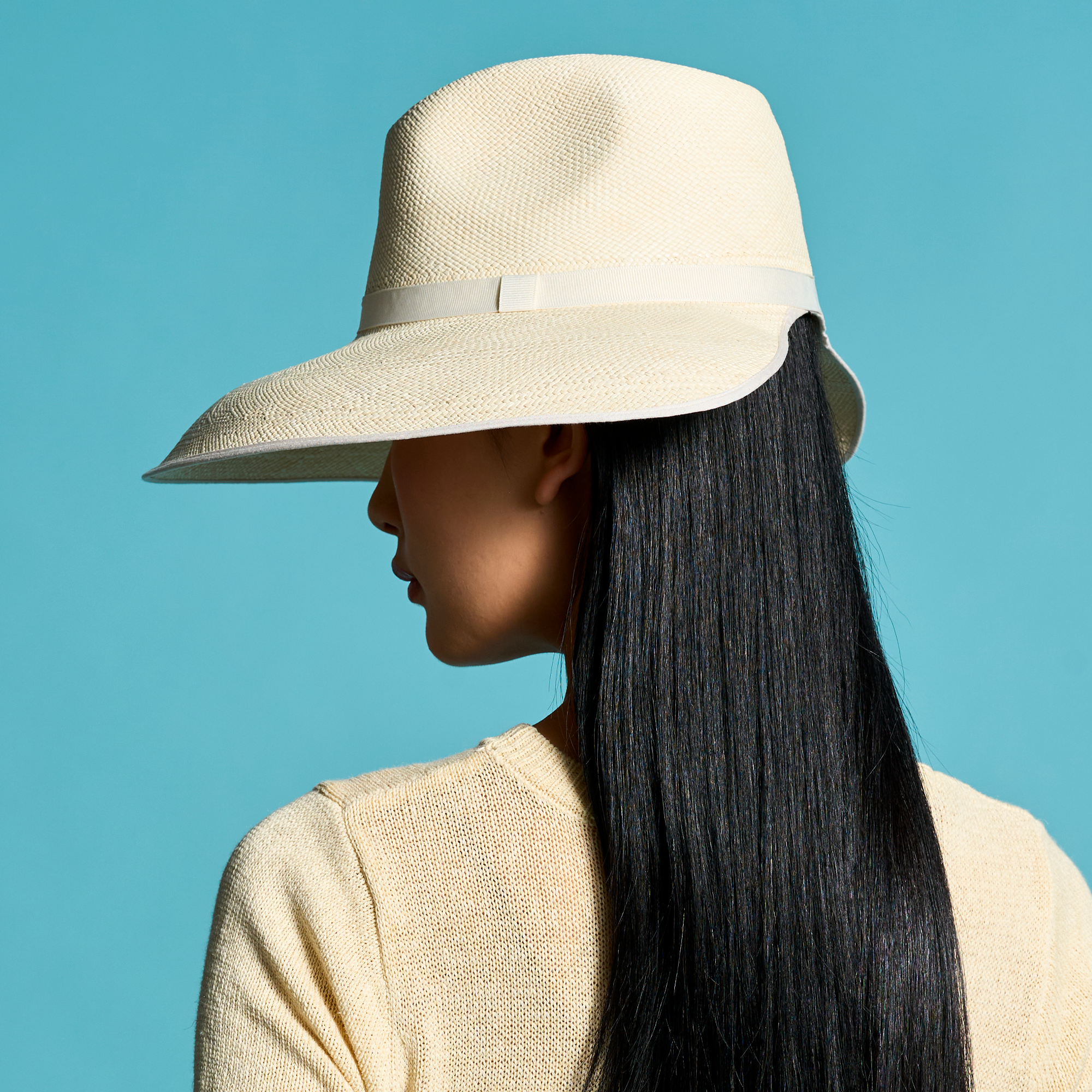Wide-brimmed straw hat in the Anna Visor Hat design made from toquilla straw