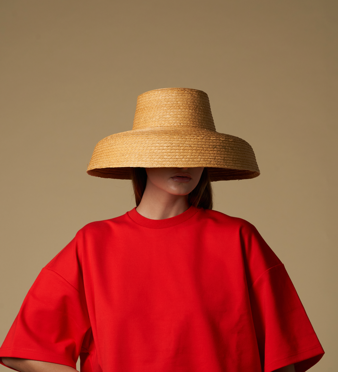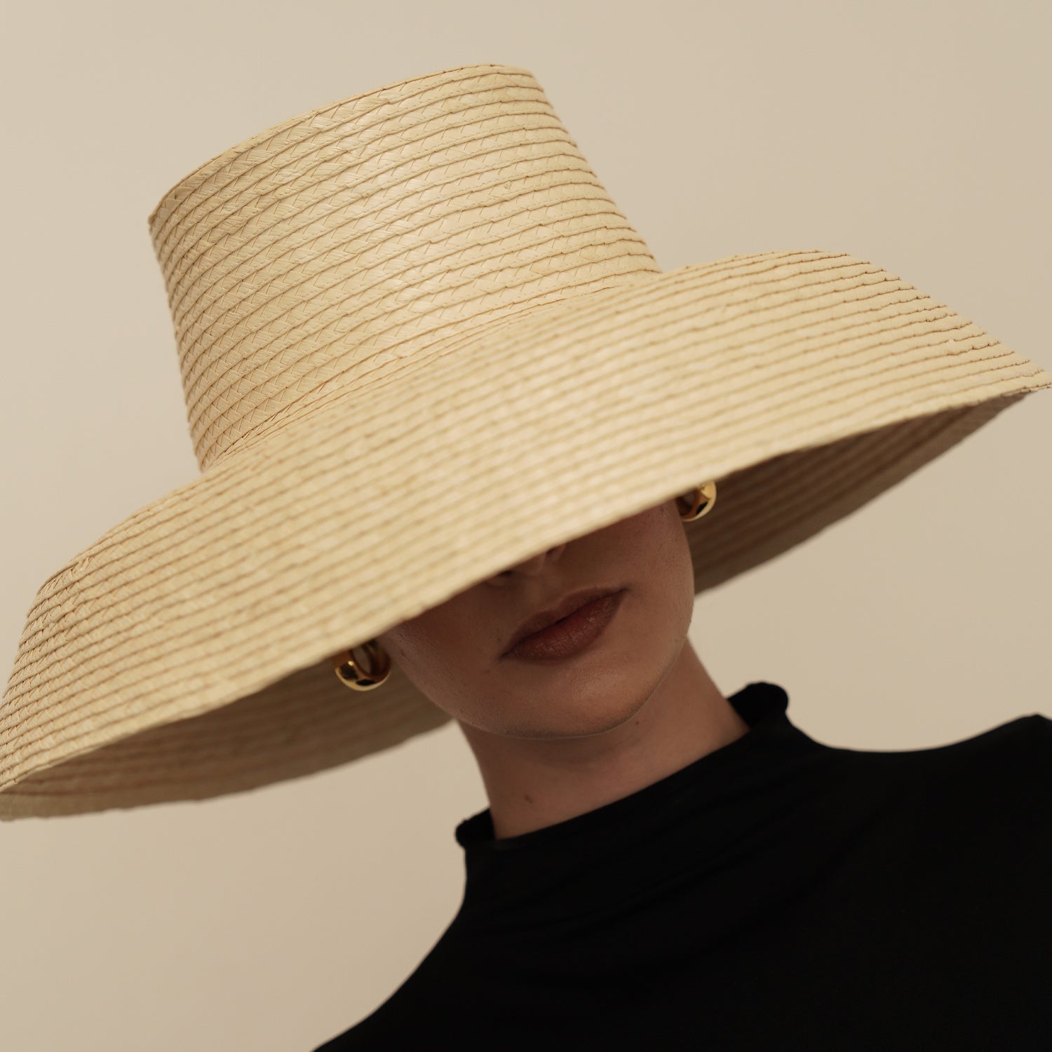 Wide-brimmed straw sun hat made from natural mocora straw, perfect for sunny days