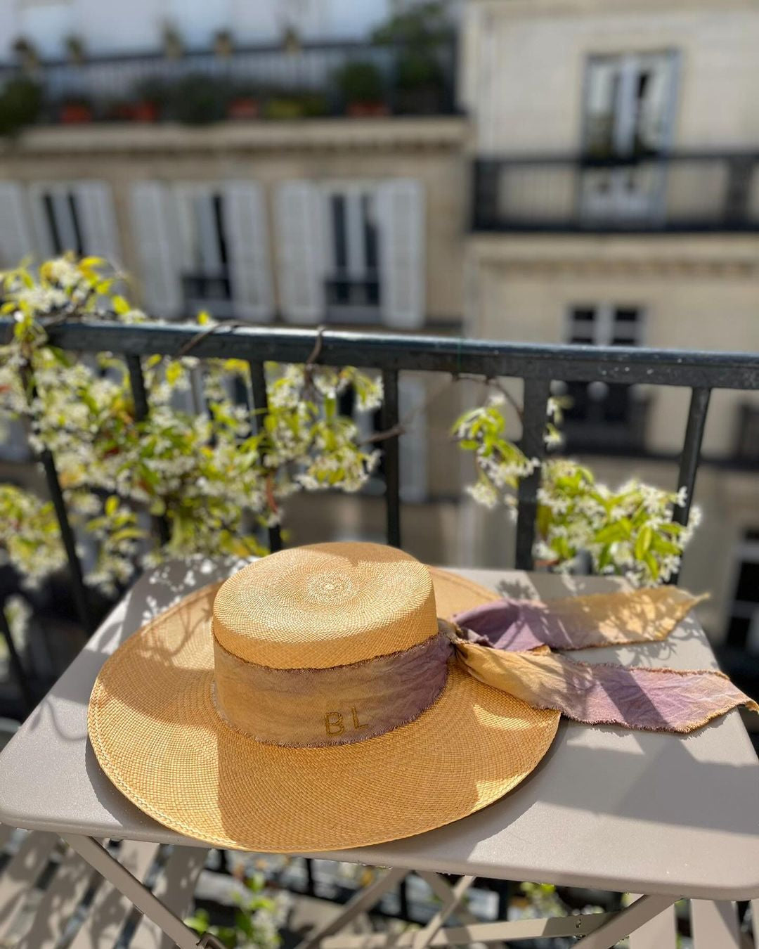Woman in a wide-brimmed hat made from hand dyed toquilla straw with custom initials
