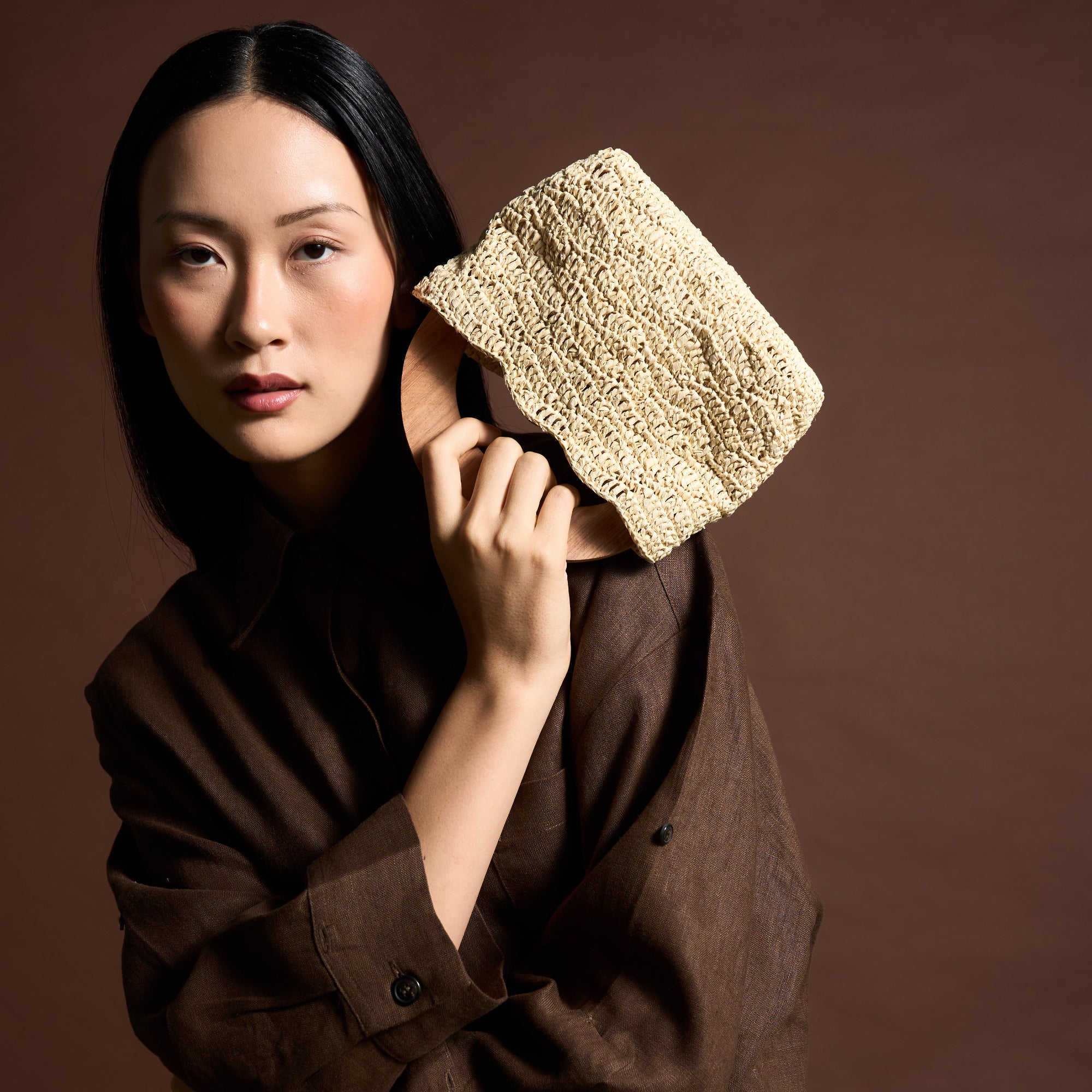 The small Isola bag, made with toquilla straw tote and natural Cedro wooden rounded handles. This mini bag features a beautiful new weaving design. Pair it with the matching bucket hat.