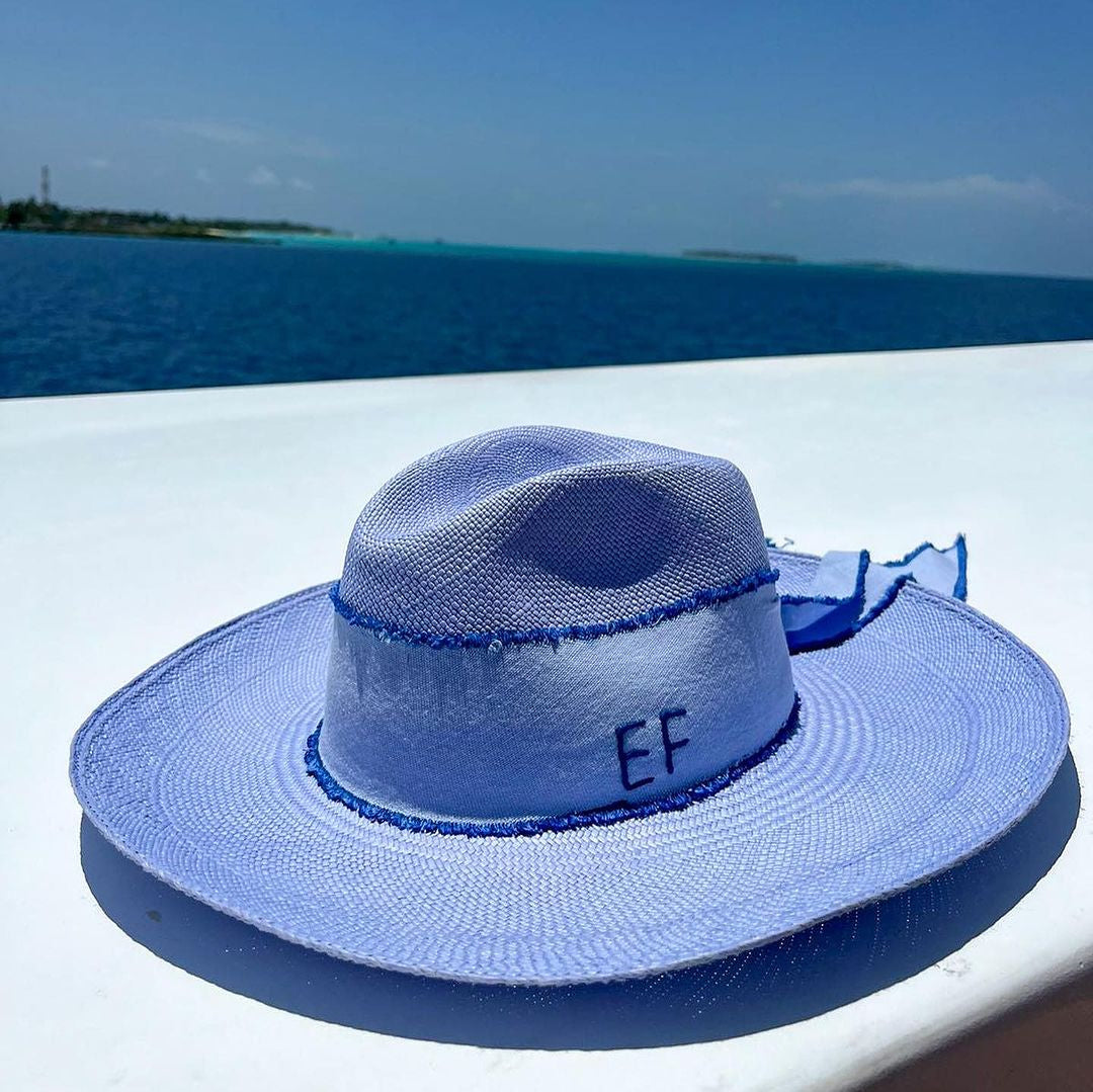 Blue hand dyed toquilla straw hat with initials, genuine Panama Hat from Izu - Resort