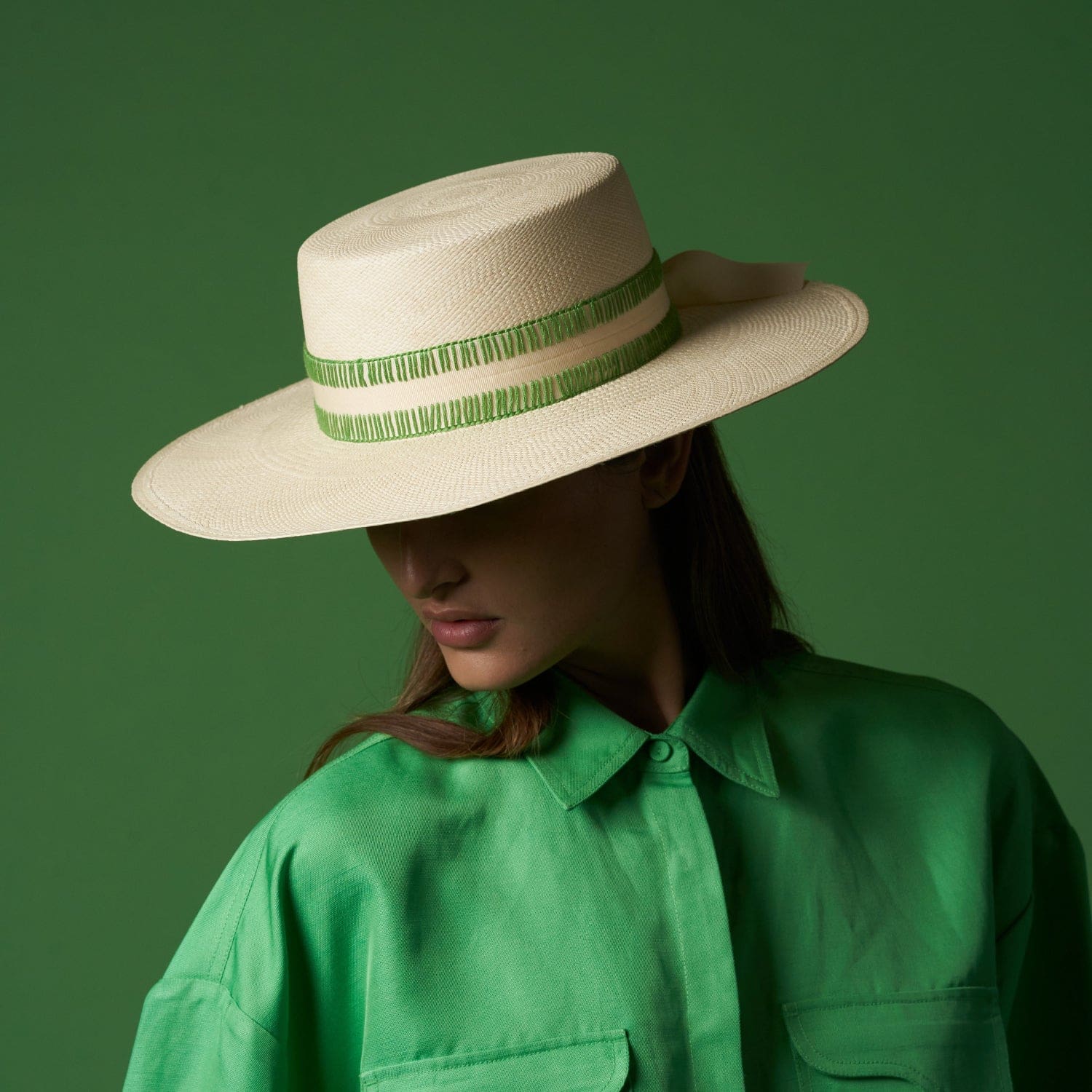 A timeless classic with an artisanal touch, the Mia Hat blends structured elegance with intricate craftsmanship. Handwoven from premium Toquilla straw, this boater-style hat features a wide brim for graceful sun protection and a chic, minimalist silhouette.