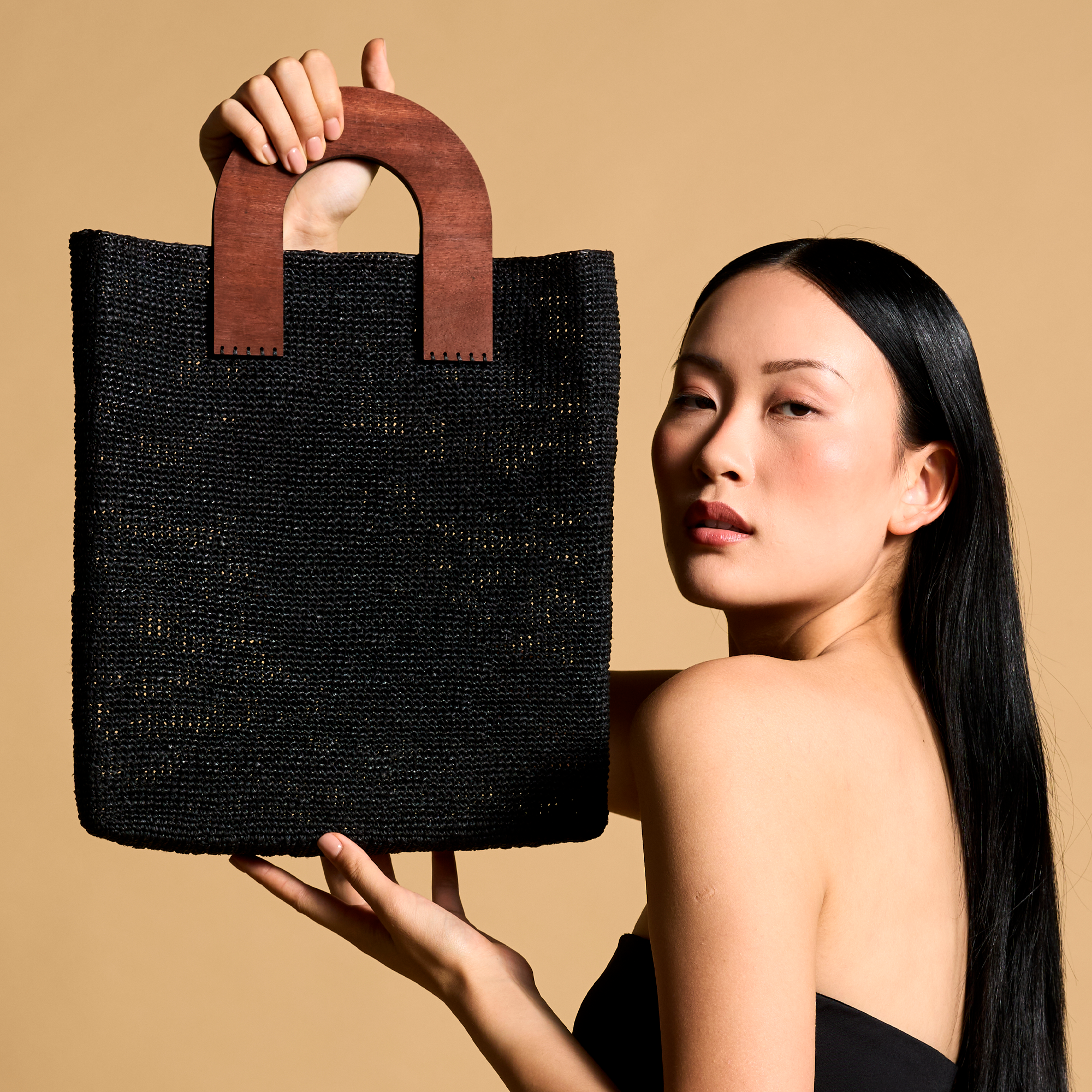 Black woven tote bag with wooden handle from Milano, ethically handcrafted for stylish use
