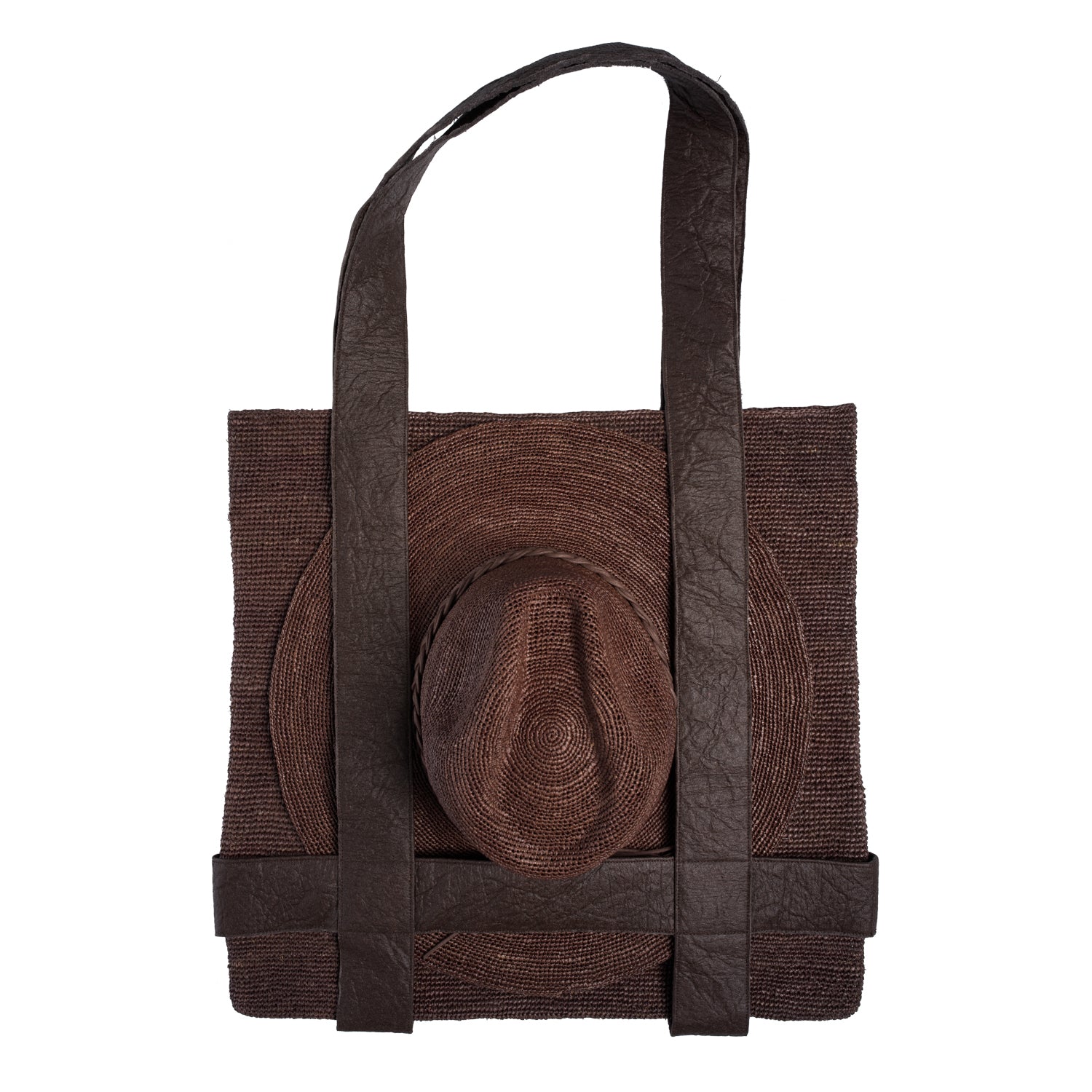 Black woven tote bag with hat made from natural toquilla straw, Nativa collection
