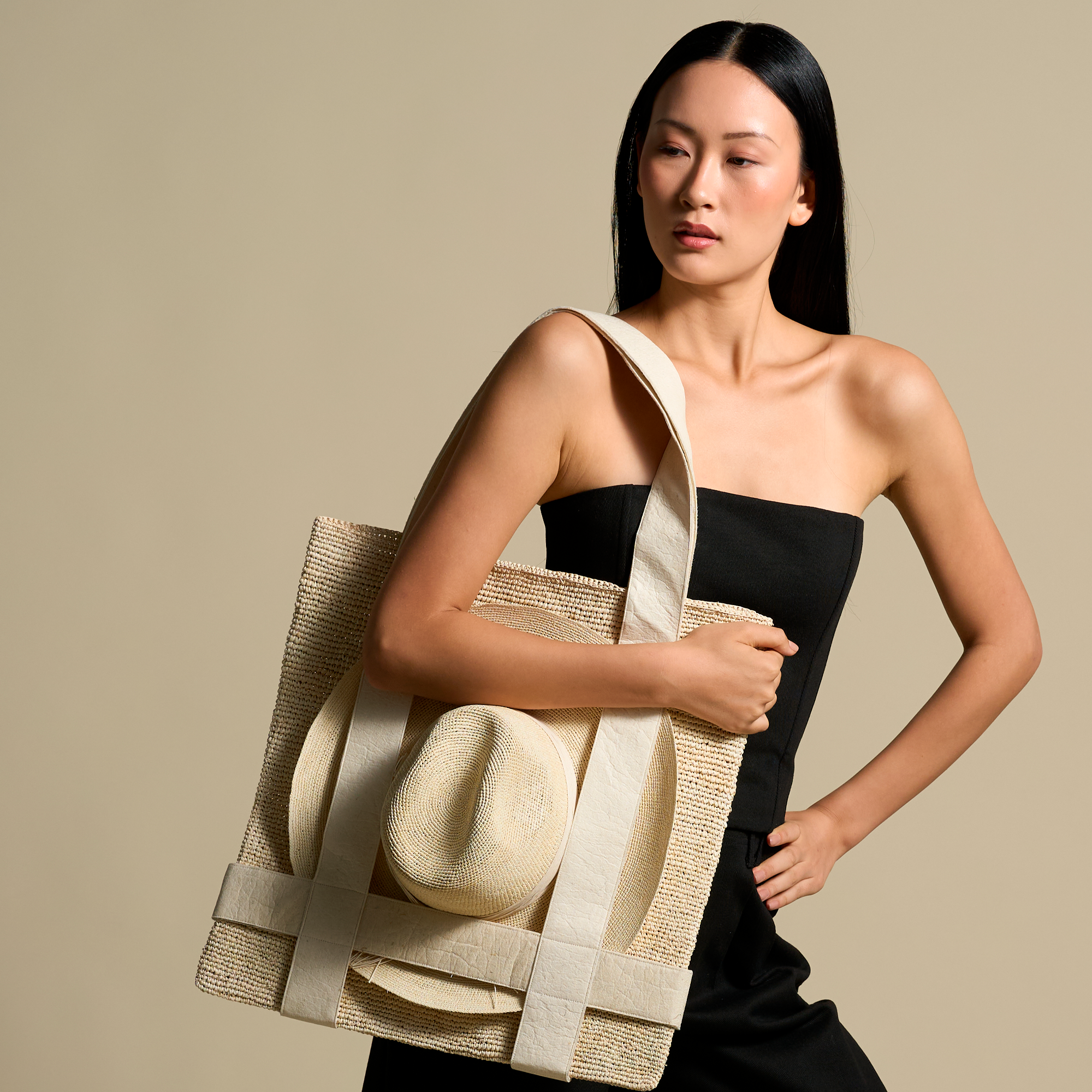 Designed with the modern traveler in mind, The Nativa is the ultimate companion for effortless getaways. Handcrafted with a soft weave of natural Toquilla straw and finished with eco-friendly Piñatex® (pineapple fiber) handles, this versatile bag features exterior straps to securely carry your hat—so you’re always ready for sunshine, hands-free.