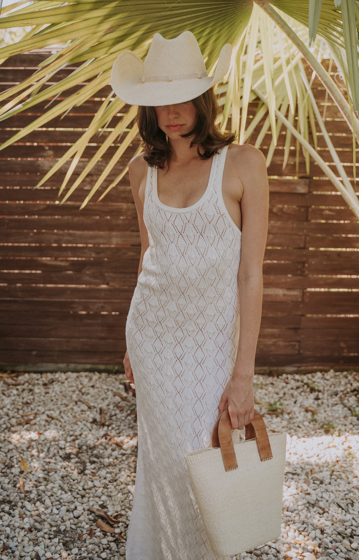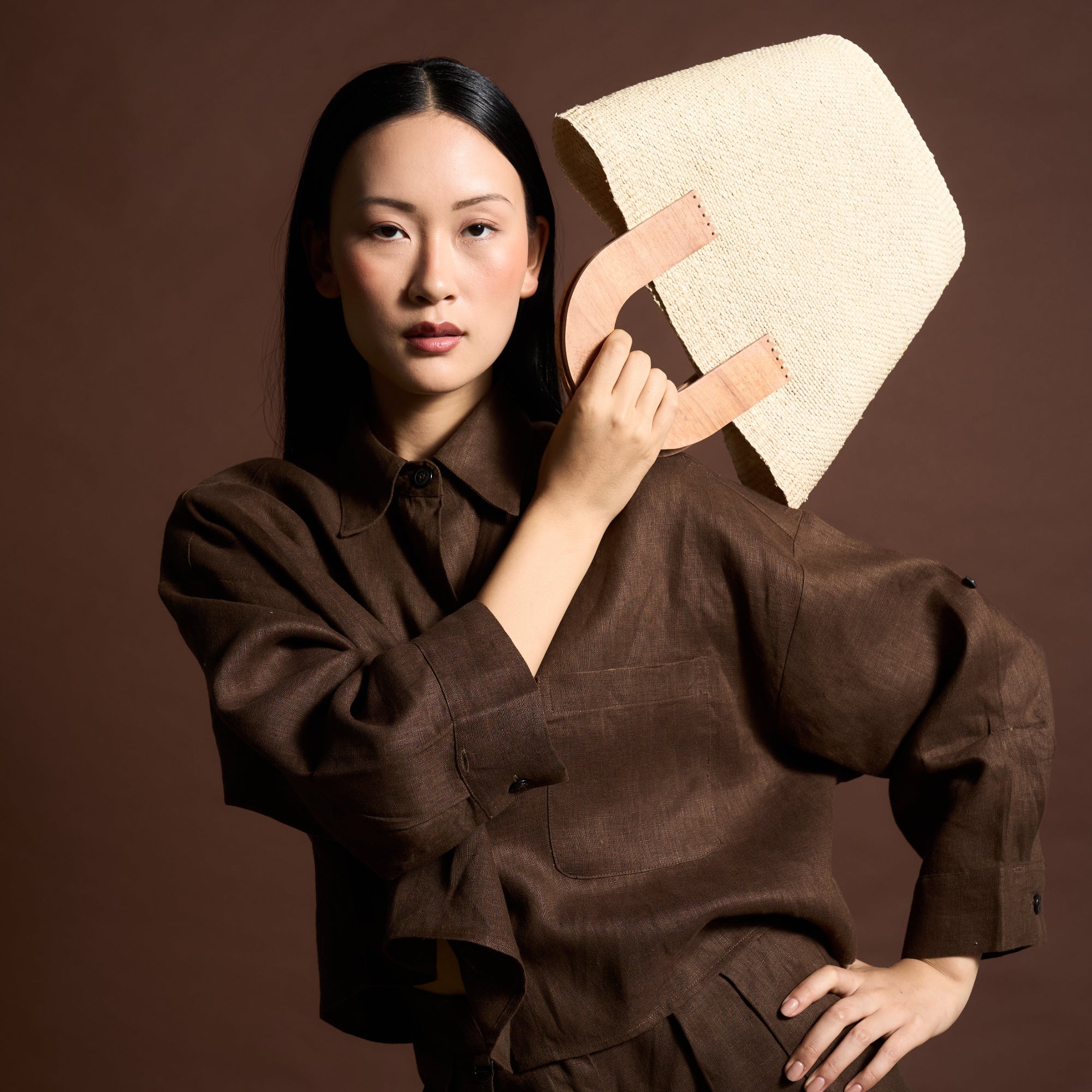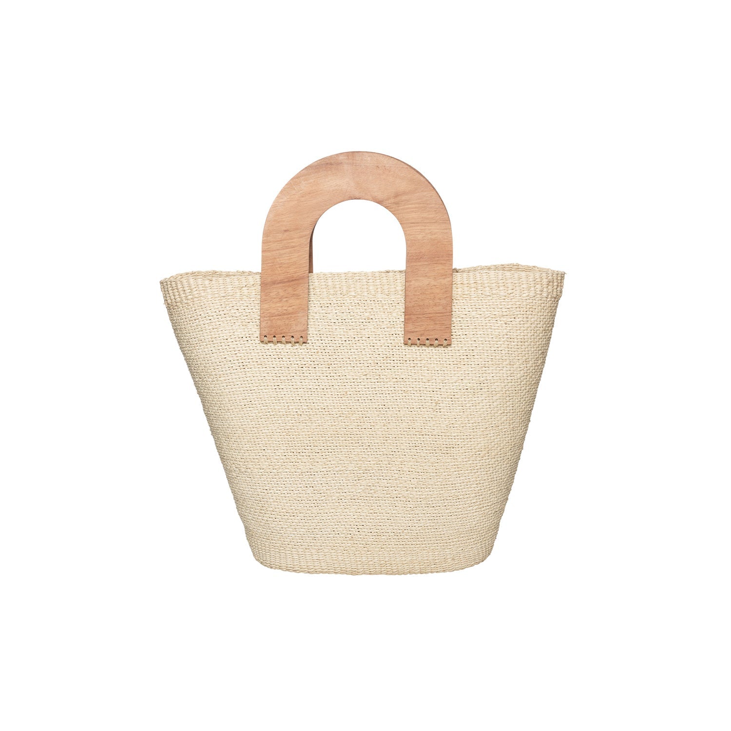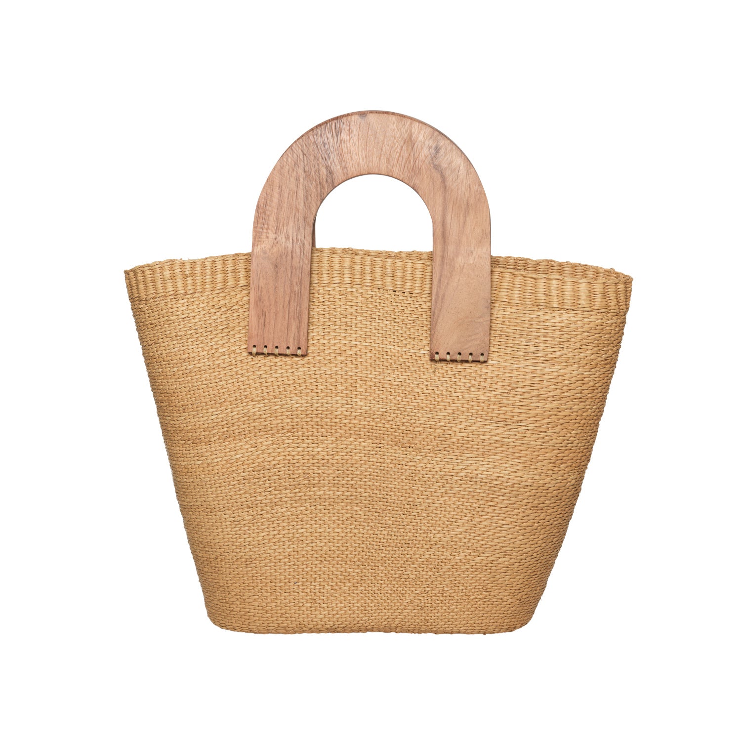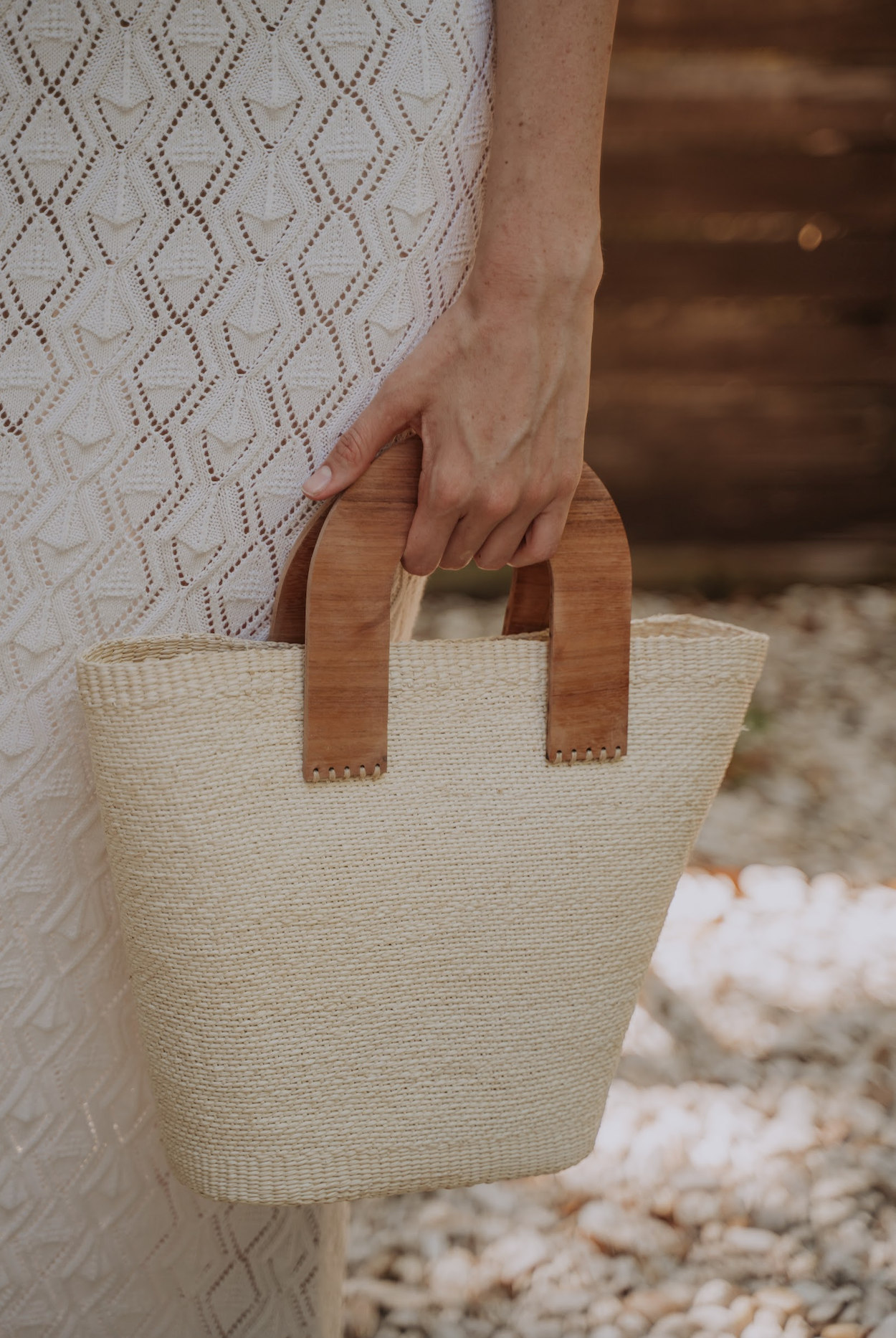 The small Positano bag is handwoven from toquilla straw and finished with rounded natural Cedro wood handles—a fresh take on a classic tote.