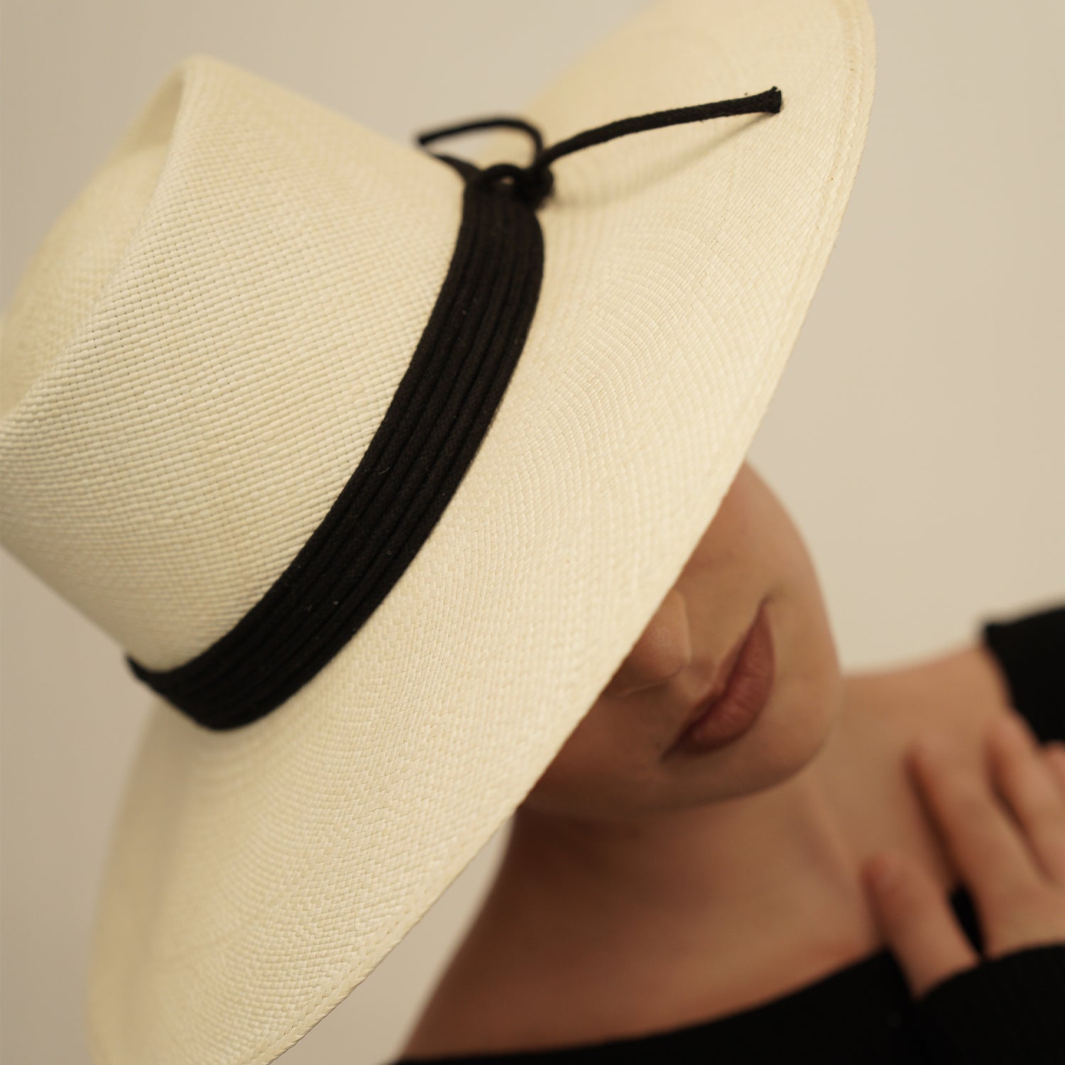 Cream-colored toquilla straw wide brim hat with black ribbon - Puglia Collection