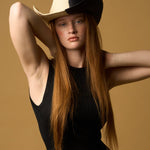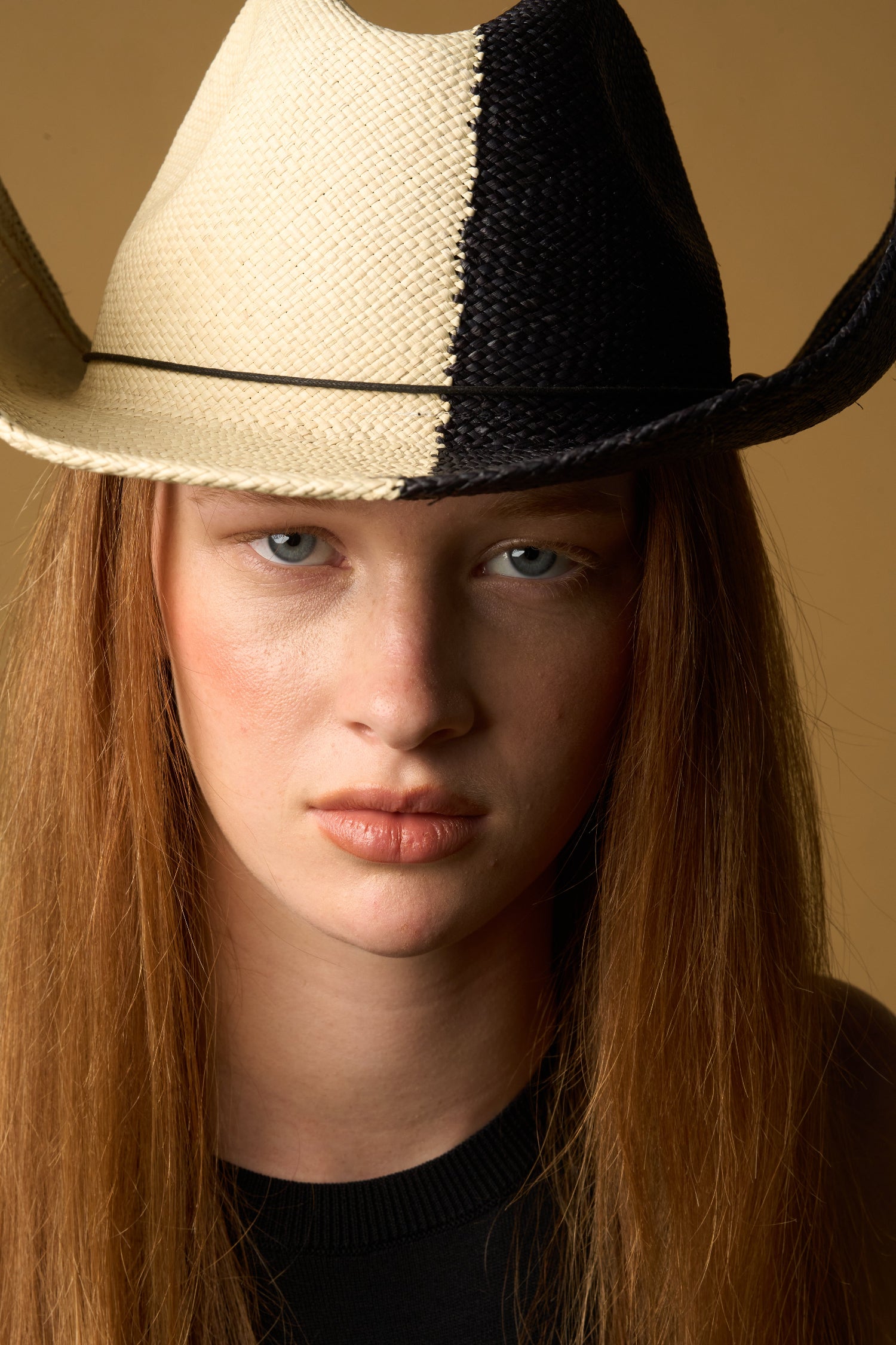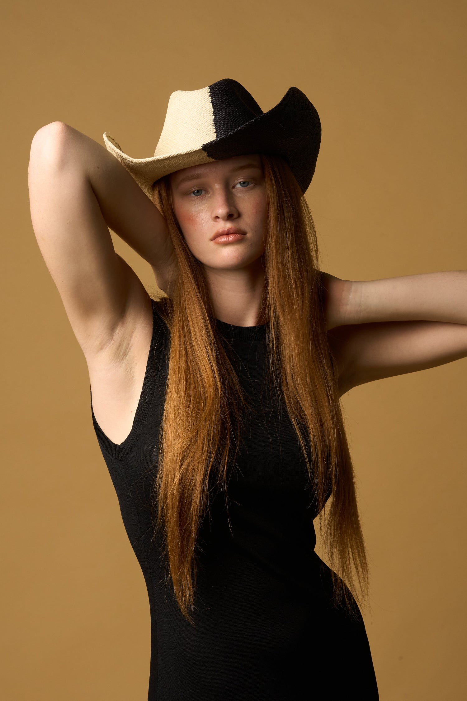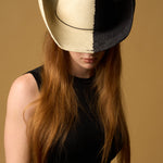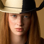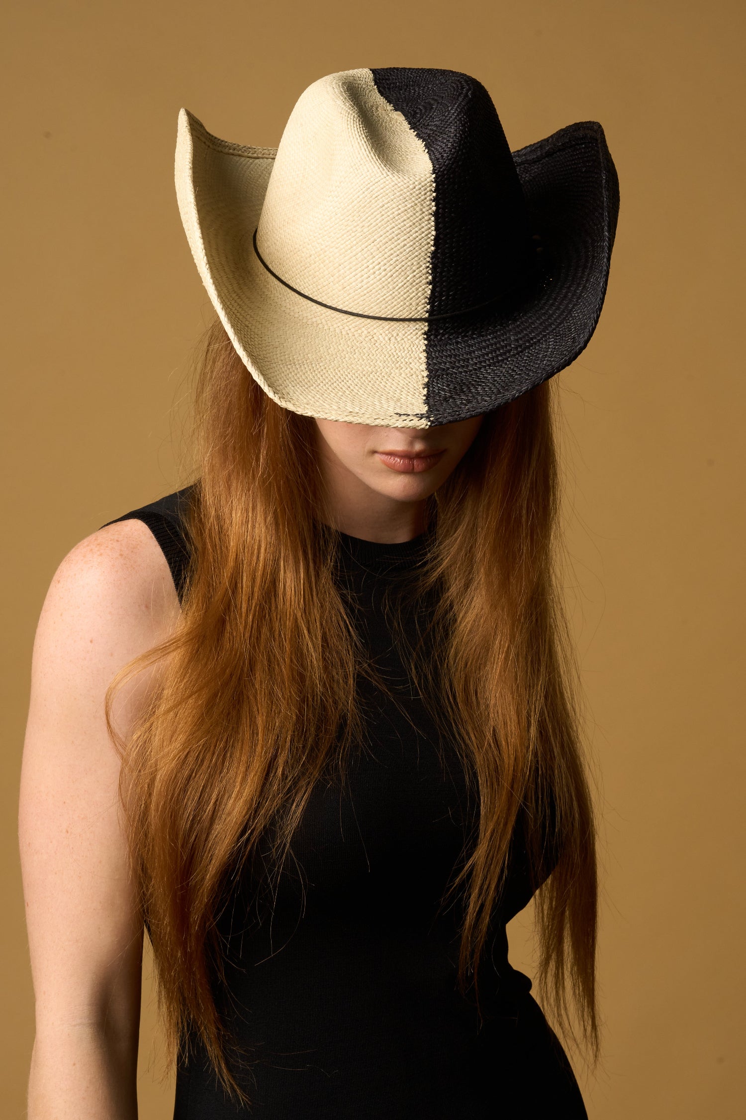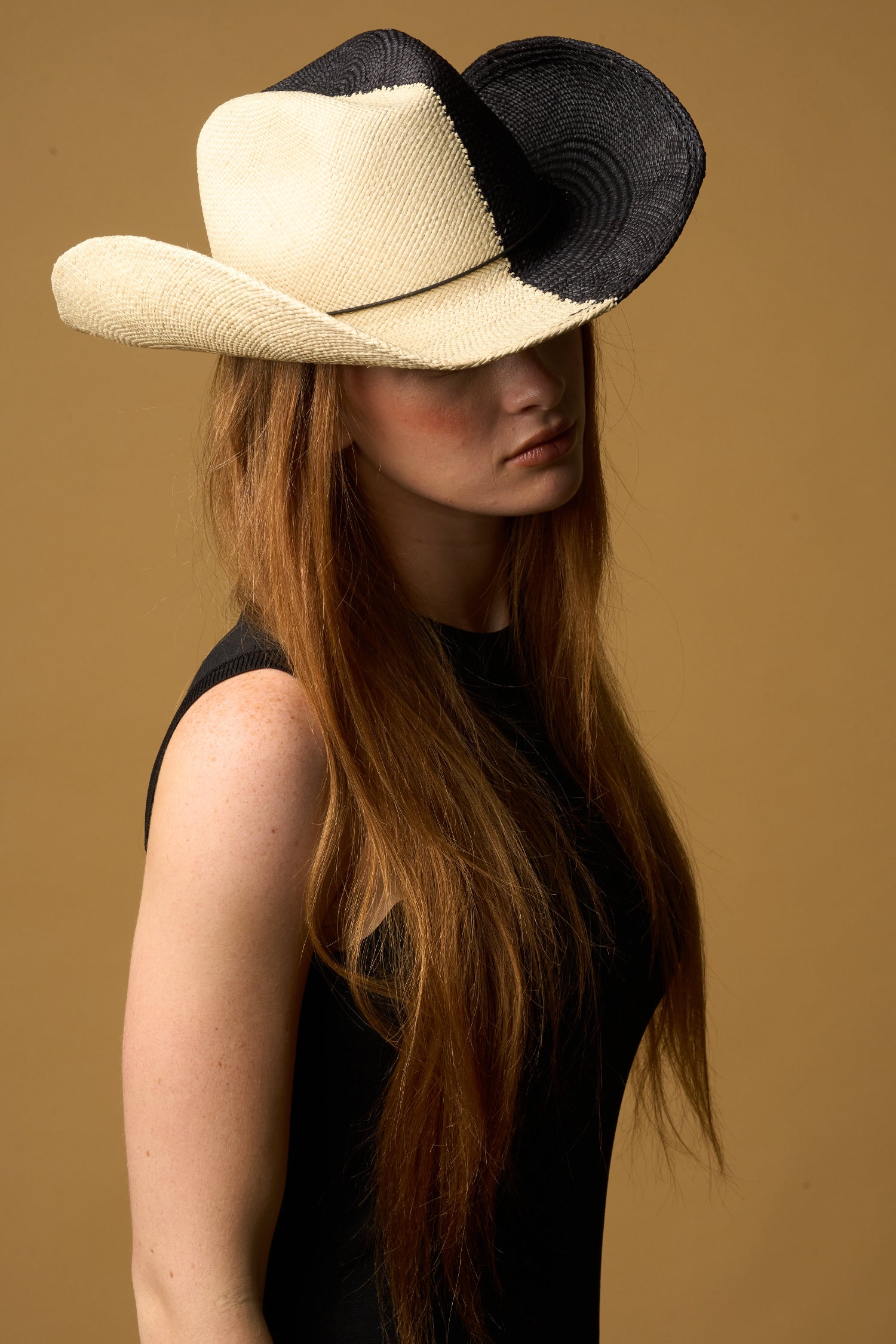 The Tambo is a bold take on the classic cowboy silhouette, defined by its striking two-tone design. Handwoven from natural straw, each piece is individually dyed in sections—creating a seamless contrast within a single continuous weave. A minimal cord with subtle bead detail completes the look, balancing rugged form with refined craftsmanship.